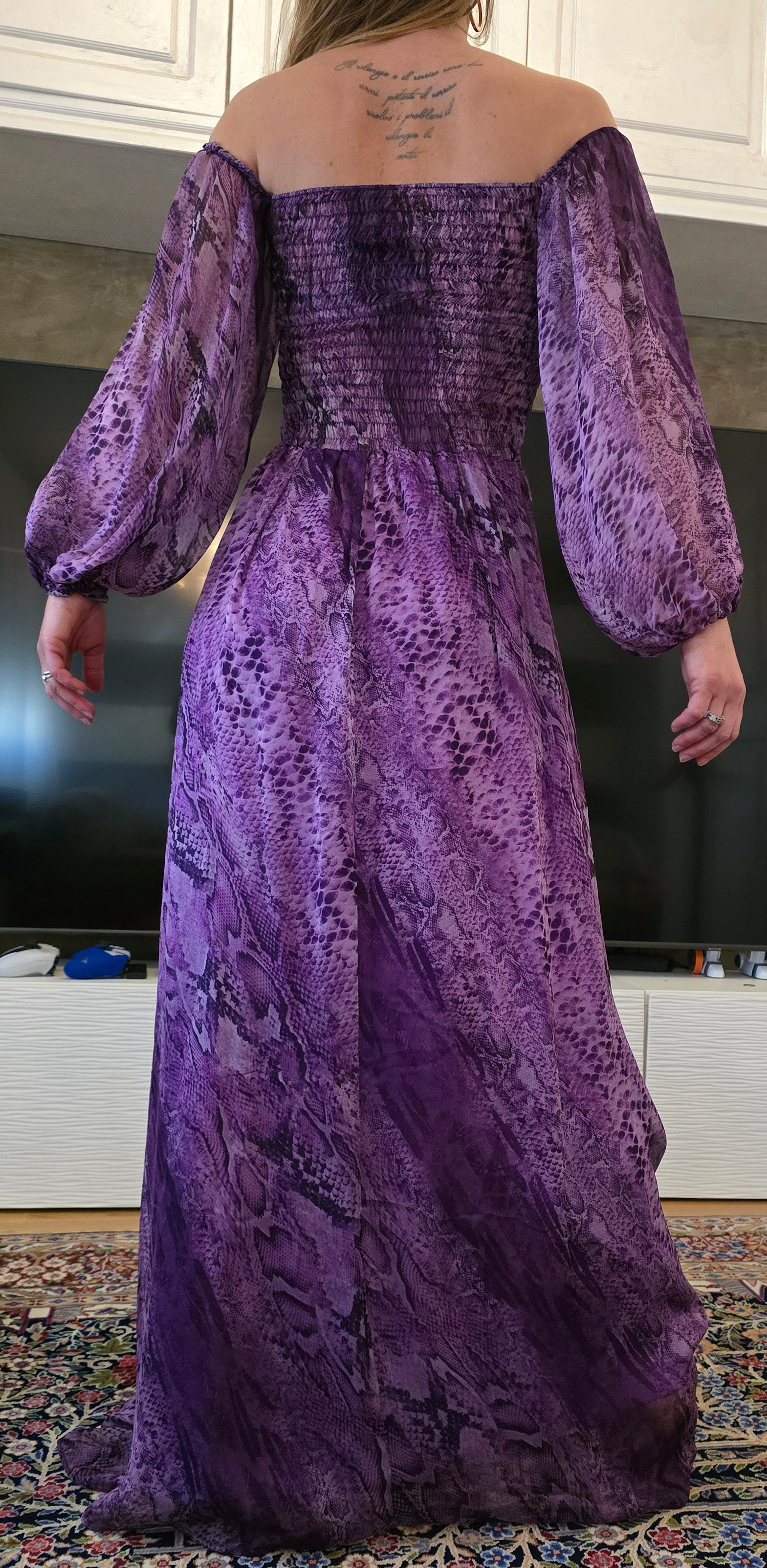 Abito lungo a spalle scoperte con stampa pitonata viola